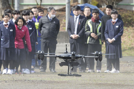 当日は雪が舞う中、西明寺中の全校生徒58人が体育館に集合し、天候の回復を待つ間にドローン学習を実施。雪が弱まったタイミングで図書「星の王子さま」を積載したドローンが西明寺小を離陸、7分後に西明寺中のグラウンドに着陸した。