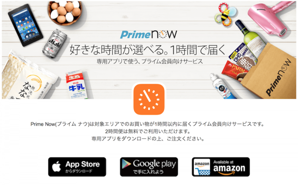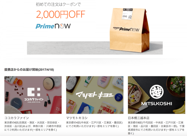 第1弾としてココカラファイン、マツモトキヨシ、日本橋三越がプライムナウのアプリに「出店」。基本配送料540円で2時間ごとの時間帯指定配達を行い、一定の購入額以上で基本配送料を無料にする。また、追加費用890円で、注文から1時間以内に届けるオプションにも対応する。