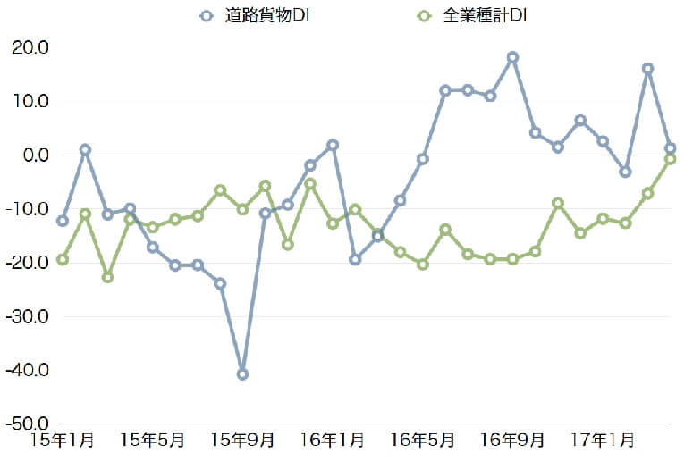 また、運輸業のうち道路貨物業の3月実績は16.1で、2月のマイナス3.1から19.2ポイントの大幅な改善となった。4月は1.3ポイントで悪化に転じる見込み。