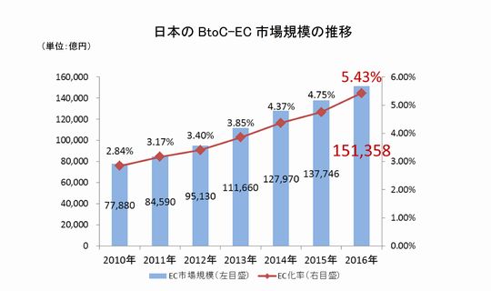 EC経済産業省が24日に発表した、2016年の電子商取引に関する市場調査結果によると、国内のBtoC-EC(消費者向け電子商取引)市場規模は15.1兆円となり、前年から9.9%拡大した。狭義のBtoBは204兆円で1.2%増、広義のBtoBは291兆円で1.3%増となった。