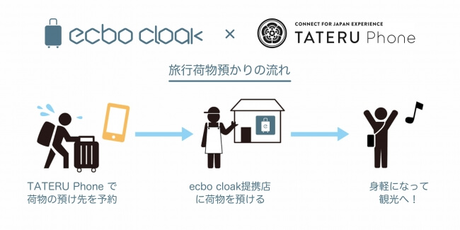 今回の提携によって、訪日観光客はTATERU Phoneを通してエクボクローク加盟の飲食店やショップに事前予約を取り、手荷物を一時的に預けることができる。大型(90リットル以上)のスーツケースの預け入れも可能で、預けた後は手ぶらで観光を楽しむことができる。