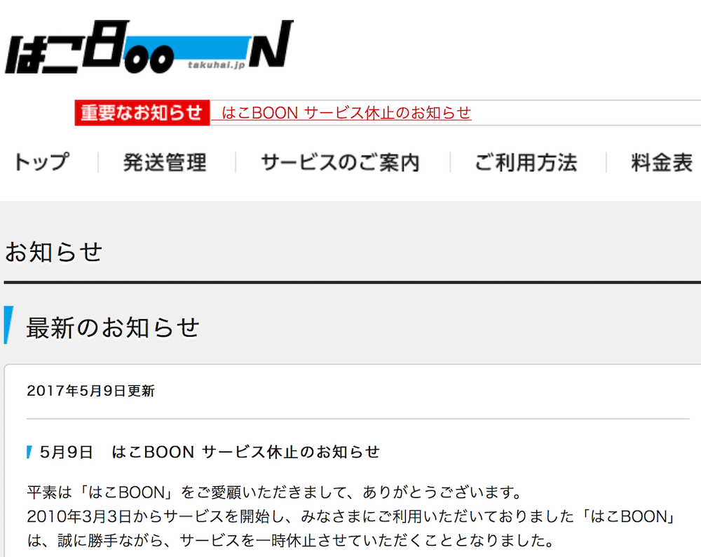 このサービスは伊藤忠商事がヤフージャパンなどと連携して提供する宅配便サービスで、9日、はこBOONのウェブサイトにサービスの休止が告知された。再開については「日程が決まり次第、お知らせ」するとしているが、「再開するかも含めて時期は未定」(伊藤忠商事)とメドが立たない状況。