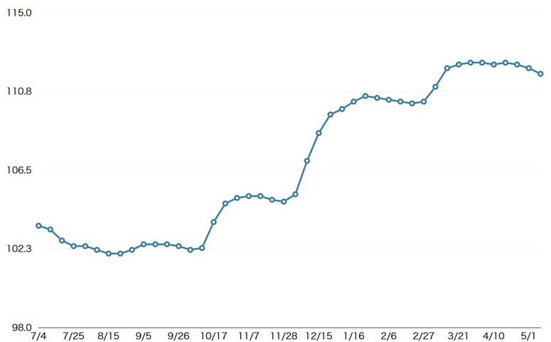 | 岡山 | 107.9 | 109.3 | -1.3% |