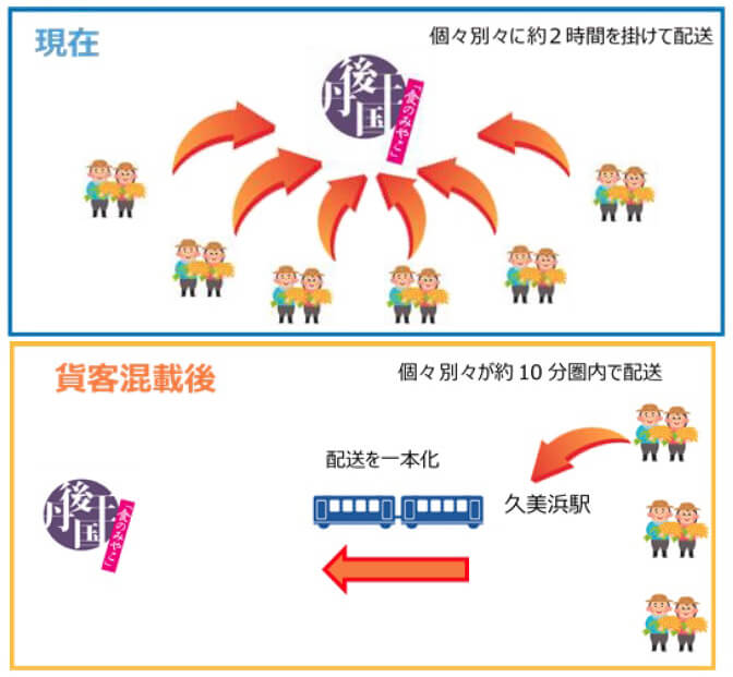 この事業では、これまで食のみやこに直接出荷を行ってきた農家が、丹鉄沿線の最寄り駅へ農産物を運搬し定期列車で輸送することで、高齢者ドライバーの増加や運転の長距離化に伴う運送にかかる負担を軽減するとともに、物流の効率化を図る。運搬に必要だった時間を農作物の生産にあてることができる環境を整えることで、生産性の向上にも貢献する。