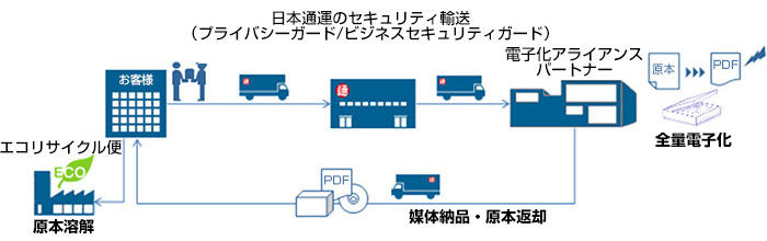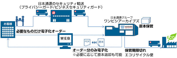 オンデマンド電子化サービスでは、ウェブ上の閲覧ページに電子化した文書を掲載し、保管期限切れとなった書類はエコリサイクル便で運搬、溶解処理を行う。必要に応じて原本の返却にも応じる。
