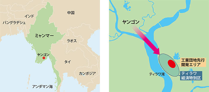 ティラワSEZは、ヤンゴン市街地から南東へ20キロに位置しており、日本をはじめタイ、シンガポールなど、建材・食品飲料・アパレル・自動車関連企業を中心に16か国、80社が進出を決めている。隣接するティラワ港では貨物ターミナルの増設やヤンゴン近郊とタイ国境を結ぶ道路の拡張も計画されている。