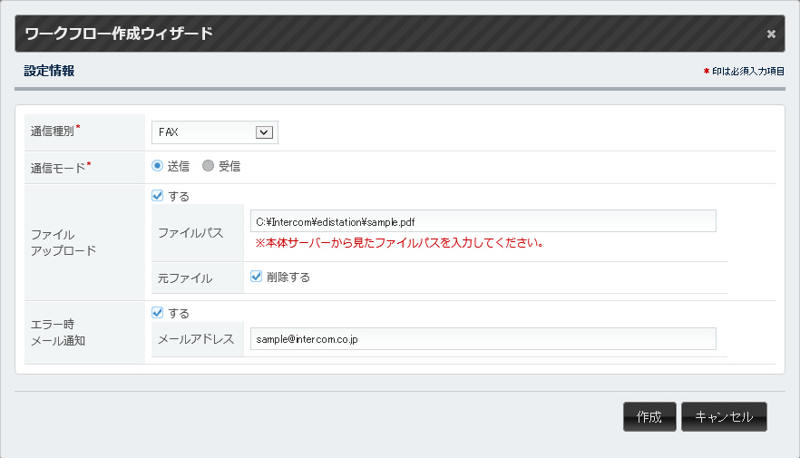 また、市販のEDIパッケージでジョブフローを初めて作成する際に、「どのように作成すればよいのかわからない」といったことを防ぐため、ウィザードに沿って条件を入力することで、新規ジョブフローを作成できる「ワークフロー作成ウィザード」を新たに搭載。これにより、通信手順ごとに送信・受信の基本的なジョブフローを容易に作成することができる。