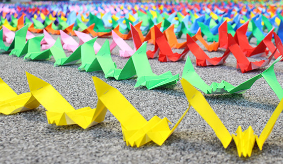 創立80周年となる20日に、滋賀事業所内の総合展示場「日に新た館」で235人が参加し、これまでの記録(2855個)を上回る5510個の折り紙をつないでチェーンを完成させ、ギネス世界記録を更新した。