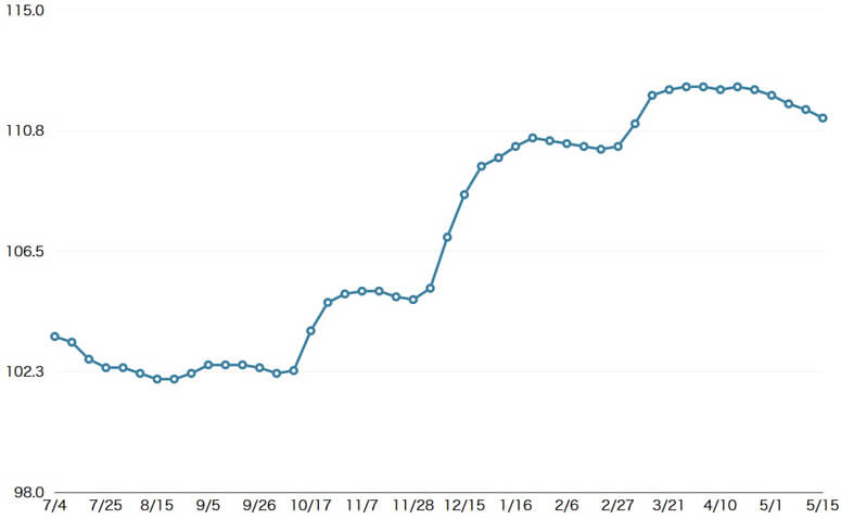 | 地域 | 5月22日(単位:円) | 5月15日(単位:円) | 上昇率 |