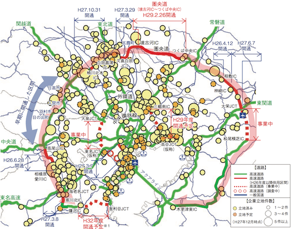 主にコスト削減やマザー工場化などの拠点強化、操業環境改善といった国内生産拠点の再編を一因とした工場立地が進み、圏央道沿線を中心にEコマースの普及を背景にした大規模な広域物流施設の立地が進んでいる、としている。