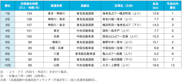 高速道路(IC区間別)の渋滞ワーストランキング上位(2015年・全国)