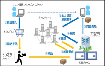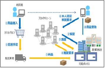 この宅配ボックスは、ブロックチェーンとIoT技術を使っており、荷物を納入する際にブロックチェーン上に納入記録・施錠要求が行われる。荷物を受け取る利用者は、個人のスマートフォンからブロックチェーン上に解錠を要求することで、宅配ボックスが解錠され、荷物の受領が記録される。