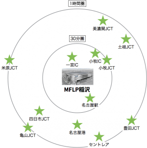 MFLP稲沢の立地特性を見ていく。まず中部地方全域や関西、関東方面への接続は、北へ5キロの距離にある名神高速道路「一宮インターチェンジ(IC)」が便利だ。
