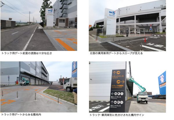 敷地南側にトラックの出入口、南北両面に乗用車の出入口を設けており、南側は乗用車とトラックの動線が混乱しないよう、上部にトラック用サイン、下部に乗用車用サインをわかりやすく表示した三井不動産独自の背の高い看板を立てて円滑な回遊性を確保した。