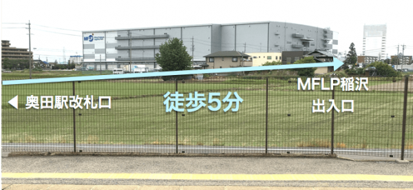 配送面は小牧エリアと同等以上の立地だといえるが、特筆すべきは最寄り駅である名鉄「奥田」駅との距離だろう。名古屋方面から名鉄本線を利用して同駅に降りると、改札口を出るまでもなく、駅ホームから東側の真正面にMFLP稲沢の全容を捉えることができる。改札口から同施設のエントランスまでは時間にして5分の短さで、これほど駅に近い物流施設は全国的にも珍しく、雇用の確保しやすさに直結する。