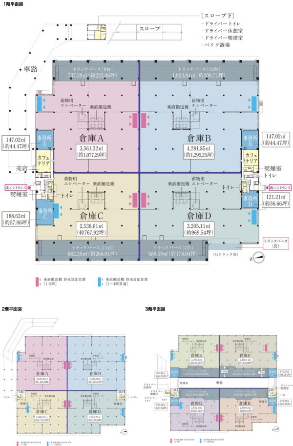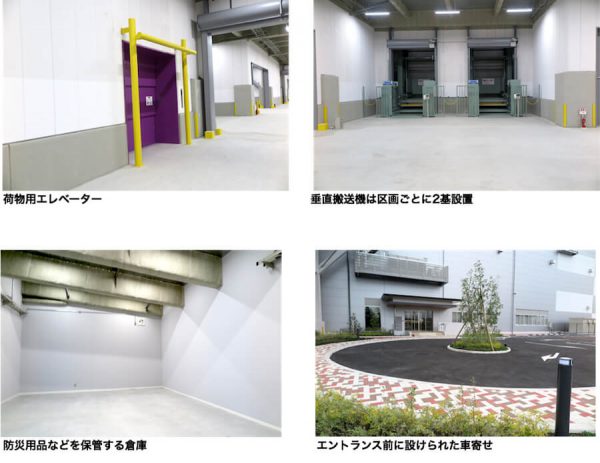 各フロアは4分割に対応しており、1・2階をセットで利用する場合の最小区画は2205坪(7290平方メートル)から。4区画それぞれに垂直搬送機2基、荷物用エレベーター1基を備え、将来的には1階から4階まで貫通可能な垂直搬送機の増設スペースを設けている。