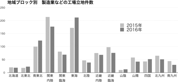 では、生産拠点の国内回帰が本格化しているのか。経済産業省がまとめた16年の工場立地動向調査結果では、製造業の工場立地は昨年1年間で件数が4.9%減、面積が0.1%増と、全国的に見れば大きな変化はみられない。しかし、業種や地域のレイヤーをめくると、輸出拡大につながる要因が見えてくる。例えば同じ期間の都道府県別立地件数は、1位静岡県(74件)、2位愛知県(66件)、3位群馬県(56件)と続き、上位2件はそれぞれ前年比34.5%増、26.9%増と伸び率も高い。ブロック別でも「東海」が212件(23.3%増)でトップ、前年1位だった「関東内陸」は17.3%減の177件となり、中部、とりわけ東海エリアへの工場集積が群を抜いている。