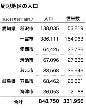 名鉄奥田駅からMFLP稲沢までは直線道路を5分ほど歩くと到着する。道路の左右は開発調整区域のため田畑が広がっているが、周辺5キロ圏内の人口は21万人超、稲沢市を中心とする周辺7市は33万世帯、人口84万人と雇用を確保しやすい。愛知県では名古屋、豊橋、岡崎、一宮、春日井、豊田の6市が事業所税の課税対象となっているが、稲沢市が非課税となってい点も評価できる。