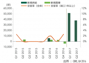 3大都市圏の中でも東京・大阪と比べて大規模な物流施設の整備が遅れがちだったこの地域では、供給の少なさから16年末時点の空室率が「0.0%」(CBRE調べ)、16年末時点にようやく2.6%へと上昇したが、「空室を抱える物件はわずか1棟で需給はタイト」(同)な状況だった。18年末までに15万坪の供給が見込まれるものの「まだまだ足りない」(大手不動産会社)状況だという。