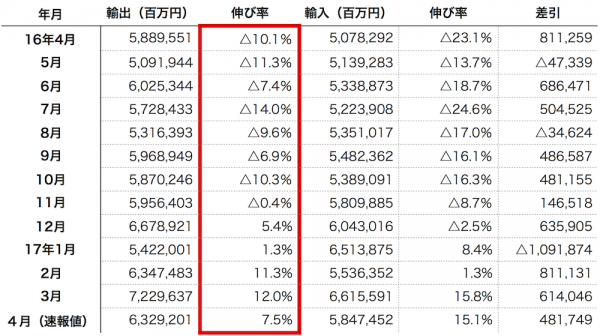 特に輸出の伸びがこうした好調さをリードしている。財務省がまとめた4月の貿易統計によると、対前年比で縮小が続いていた輸出は2016年下半期以降、徐々に上向き、12月に5.4%増の6兆6789億円とプラスに転じると、直近の発表である17年4月まで5か月連続でプラス(前年同月比)をキープしている。