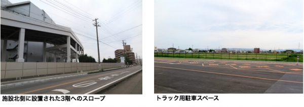 1階、3階のトラックバース(12.8メートル)は計80台分を用意、待機スペースもトレーラー5台分、10トントラック18台分、中型トラック14台分とバランスの取れた配分としている。また、移動に自動車を利用するケースの多い地域事情に配慮して乗用車用の駐車場は159台分を確保し、通勤しやすさをサポート。このほかにバイク置き場18台分、駐輪場122台分を併設する。