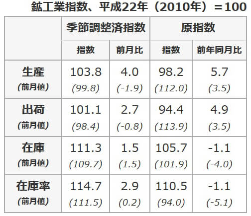 調査・データ経済産業省が5月30日発表した4月の鉱工業指数(速報)は、生産指数が103.8(季節調整済)で前月と比べ4%上昇、出荷指数101.1で2.7%上昇、在庫指数111.3で1.5%上昇、在庫率114.7で2.9%上昇となった。