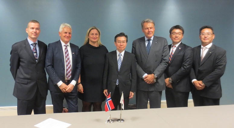 (画像:左から2番目・Dualog社のリンド-オルセンCEO、3番目・アイハン貿易産業副大臣、4番目・田端国土交通審議官、5番目・日本郵船のスヴェイン・スタイムラー経営委員)