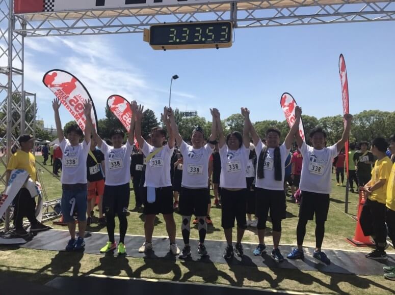 このマラソンは、1周2キロの陸上競技場のコースをチームで周回するもの。