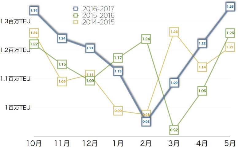調査・データゼポ・データマイン(米国マイアミ)のまとめによると、5月にアジア10か国から米国へ向かった海上コンテナの合計は、単月として過去最高の135万個を記録し、前年5月の実績を7.7%上回った。4月も前年同月比で11%増えており、1月から5月の累計輸送量は5%増の603万TEUとなった。