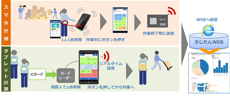 また、作業状況はリアルタイムにウェブに送信されるため、作業進捗状況をすぐに確認することができる。タブレットを使った計測は、1つの作業を長時間繰り返すため作業ボタンの切替えが必要ない場合や、よりコストを掛けず簡単に作業計測をしたい際に適している。