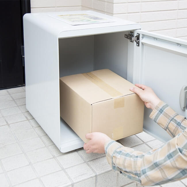 この製品は、不在時に荷物の受け取りができる宅配ボックスで、亜鉛メッキ鋼板を採用し、耐久性が高く、防サビ・防水仕様と堅牢性を高めている。