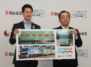 具体的には福山レールエクスプレス号のコンテナや集配車両(2トン車)に大型ステッカーを貼り付け、情報発信に役立てるほか、同社の産直便を活用した県産品の販売促進、災害時の支店・営業所・社宅などの施設の提供を行う。