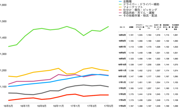 同月の全国平均時給は1167円(前年同月比5.7%増)で、業種別では調査した12業種中6業種がプラスとなった。「物流・倉庫」は1179円で、81円(6.9%増)増加した。
