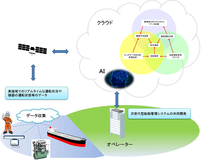 三井造船が提供するデータ収集装置を通じ、商船三井の運航船から収集した実海域でのリアルタイムな運航状況や機器の運転状態などのデータを用いて、次世代型船舶管理支援システムの開発を進める。