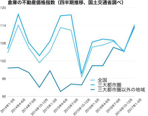 倉庫に限定した指数は114.3だったが、前年同期からの伸びは7.1%と商業用不動産全体の価格指数の伸びを大幅に上回った。