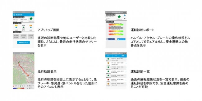 また、アプリの全ユーザーの運転情報を解析しスマートフォンにフィードバックすることで、急ブレーキの多い場所を危険度表示し、ドライバーの安全運転への意識を高める。