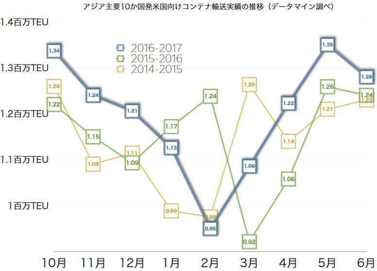 調査・データデータマイン(米国マイアミ)は7日、アジアから米国へ向かう海上コンテナ輸送の6月実績を発表した。アジア主要10か国・地域発のコンテナ輸送量は3.7%増の129万TEU、1月からの累計も4.8%増の732万TEUとなり、単月・上半期ともに過去最高を記録した。
