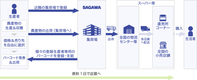 具体的には、佐川急便が集荷場からの販売者への納品業務、販路、生産者の相互紹介、生産者からの集荷・梱包代行を行い、農業総合研究所が農産物直売の全国インフラ構築、海外輸出情報の開示、佐川急便の営業所を農産物の集荷場として活用――などで連携する。