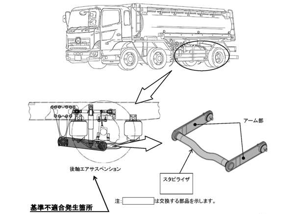 行政・団体日野自動車は11日、大型トラック「日野スーパードルフィン」「日野プロフィア」で、後軸エアサスペンションのスタビライザアームの強度が不足しているため、最悪の場合、アームが折損し走行できなくなるおそれがあるとして、同日に国土交通省へリコールを届けたと発表した。