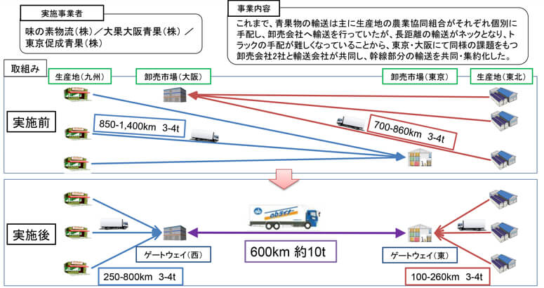 計画では、東北エリアから大阪、九州エリアから東京へ、複数台で個別に輸送されていた青果物輸送を、東北からのものは東京で、九州からのものは大阪で積み替え、東京・大阪間を1台のトラックに集約。