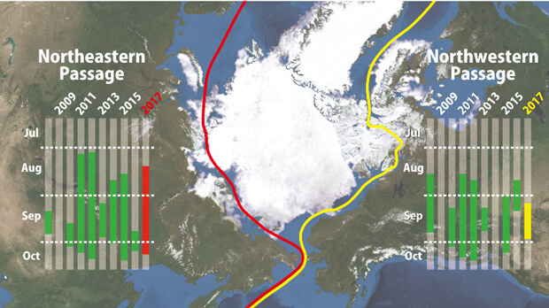 (画像:17年7月13日時点の北極海の海氷分布。緑色部分・過去の航路開通期間、赤と黄色部分・17年の予想開通期間)