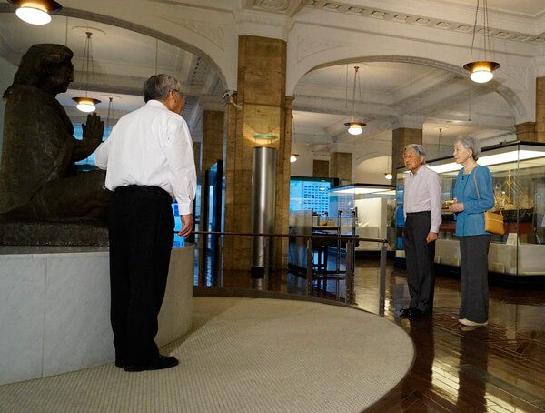▲殉職戦没社員冥福祈念像の説明をお聞きになる両陛下