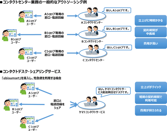 そこで、インターファクトリーと提携し、エビスマートとヤマト運輸の「宅急便」を利用するEC事業者向けに、コンタクトセンター業務を安価でアウトソーシングできるコンタクトデスク・シェアリングサービスを提供することにした。