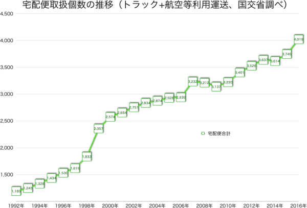 ロジスティクス国土交通省が28日公表した宅配便取扱実績によると、2016年度は15年度より2億7400万個(7.3%)増え、トラック・航空便利用合わせて40億1900万個となり、初めて40億個の大台を突破した。