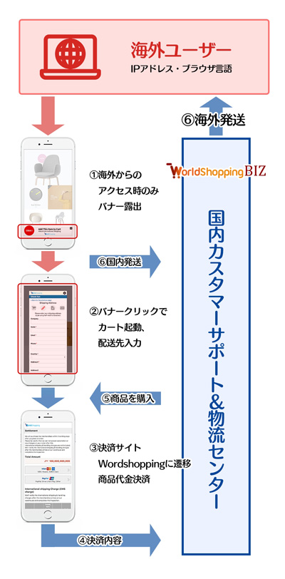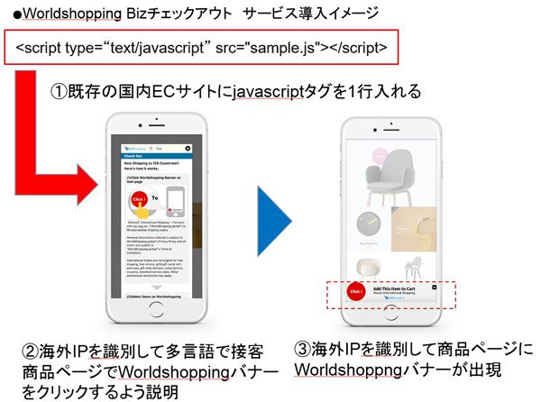 チェックアウトは既存の自社ECサイトにjavascriptタグを1行追加するだけで、125か国向け越境EC対応が可能になるサービスで、海外アクセスユーザーのみに表示される海外ユーザー専用の商品選択・注文受付・海外配送住所入力フォーム(ワールドショッピングチェックアウト)で海外利用者からの注文受付から購入代行・海外配送対応まで、ワールドショッピングを通じて簡単に提供できるようになる。