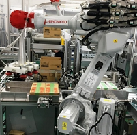 新工場は、販売品種や包装仕様を見直すことでライン数を大幅に削減し、包装工程で仕様の異なる2ラインの対応を1台で行う多機能型ロボットを導入、「省投資」ながら省スペースで自動化を実現した。