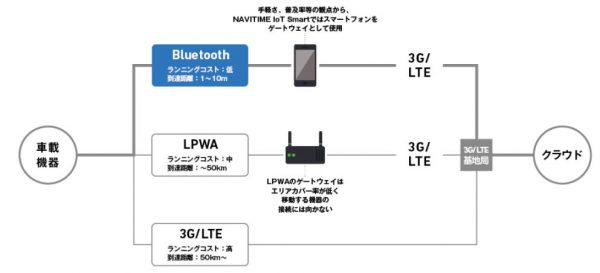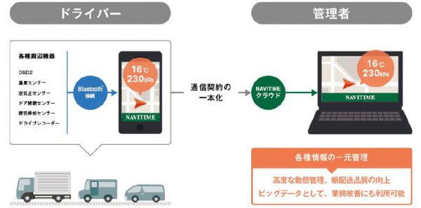 そこでナビタイムIoTスマートでは、これらの機能やセンサー情報などをスマートフォンに搭載されたBluetooth経由でクラウド上に集約し、ビジネスナビタイム動態管理ソリューションやトラックカーナビ上で一元管理できるようにする。