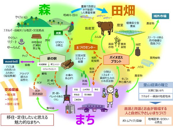 具体的には、これらの廃棄物系・未利用バイオマス資源の有効活用を進め、5年以内に三つのプロジェクトを事業化するほか、10年以内に設定したプロジェクト群(善意・資源・経済の循環プロジェクト)を推進。バイオガス化事業では、廃棄物系バイオマス資源の生ごみ、畜産ふん尿、動植物性残さなどをメタン発酵処理でバイオガスと液肥へ変え、バイオガスは発電、液肥は町内の農地に還元する。