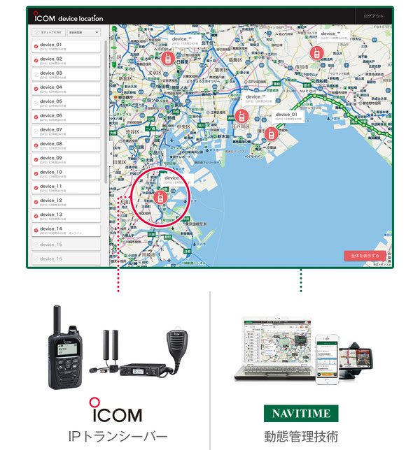サービス・商品ナビタイムジャパン(東京都港区)は23日、無線通信機器製造のアイコムと共同で、10月2日からアイコムのIPトランシーバーによる動態管理サービスを提供開始すると発表した。