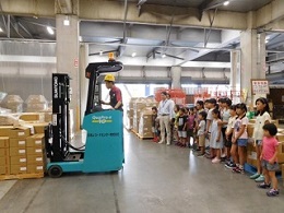 その後は、1万5000坪の厚木三田物流センターを見学。同社の菊地和彦社長が屋上から1階までの全5フロアーを案内し、参加した子供たちは膨大な数のCDやDVDが並ぶ棚のピッキング作業、圧着機によるラッピング作業、荷物がベルトコンベアからシューターへ次々に流れる様子、フォークリフトによる入庫作業――など、「本物の物流センター」の迫力に興奮を隠せない様子だった。